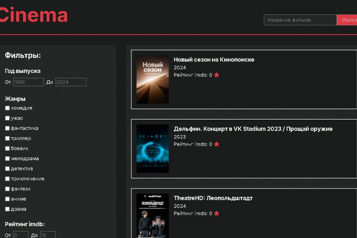 Веб приложение, позволяющее искать фильмы по названию и фильтрам, и просматривать информацию о них. Сделано на React + TypeScript, дизайн сделан мной. Информация о фильмах берется с KinopoiskAPI.