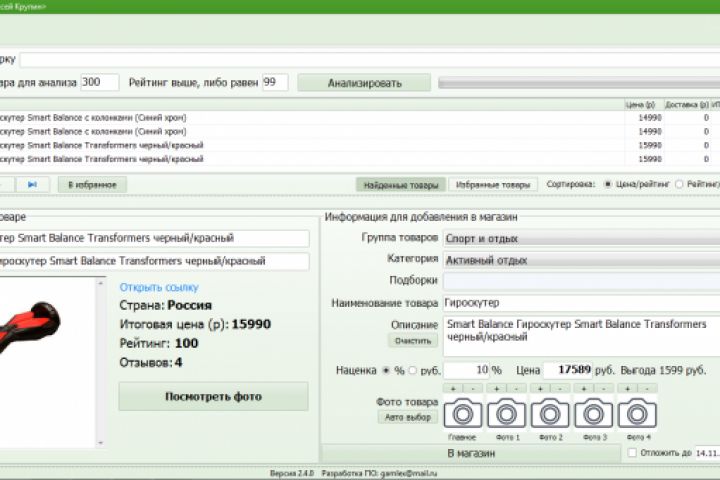 Подходящий найденный товар можно тут же выложить в качестве товара в магазин Вконтакте с нужной наценкой. Для этого всего лишь нужно выбрать категорию, заполнить название и нажать кнопку.