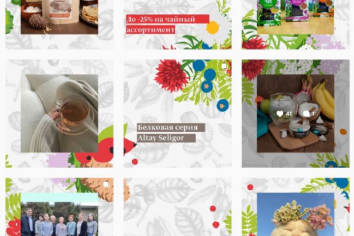 Для этого вместе с дизайнером мы создали макеты для постов с иллюстрациями знаковых ингредиентов продукции, они же символы флоры региона: орехи, лекарственные растения, ягоды.