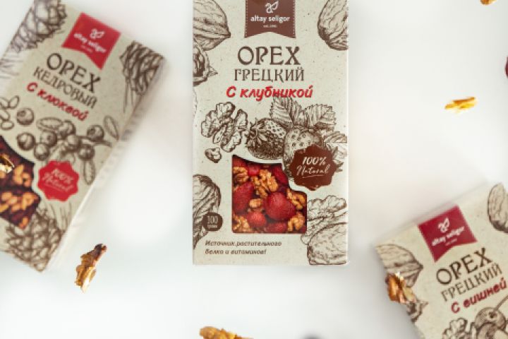 В рамках работы с компанией-производителем были предложены и одобрены: идея продукта, состава, продающие тексты на упаковке. Орех кедровый с клюквой Орех грецкий с вишней Орех грецкий с клубникой