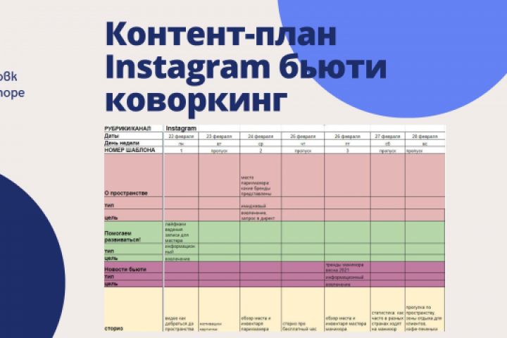 Недельный контент-план для старта ведения Instagram бьюти-коворкинга.