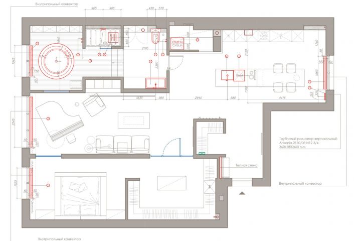 планировка с обозначением теплых полов, радиаторов и точек подключения отопительных приборов