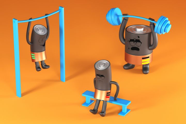3D модель отражает сюжет, на котором 3 батарейки занимаются спортом, каждый из персонажей находится в индивидуальном состоянии: разряжена, работает и заряжена.