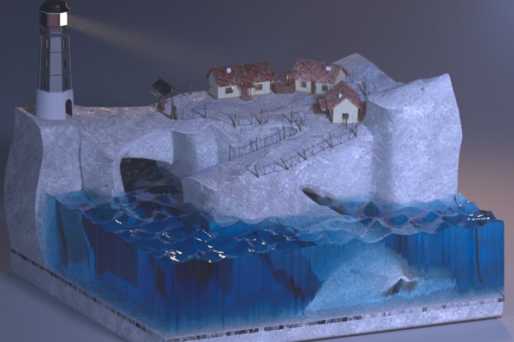 Композиция представляет собой 3D модель, содержащую объекты из стекла и бетона. В композицию вошли остров, на котором стоит маяк с фонарем, и небольшой поселок хранителей маяка.