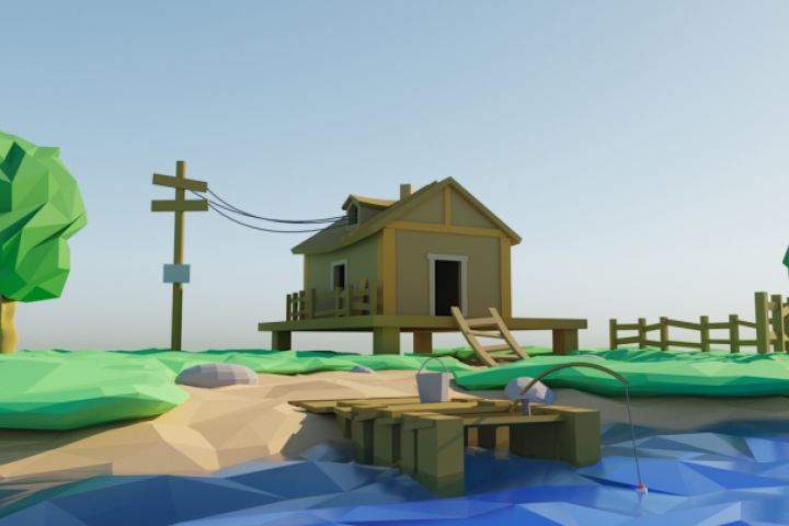 Композиция состоит из домика рыбака расположенного на острове рядом с берегом озера. Все объекты входящие в сцене выполнены в технологии LowPoly