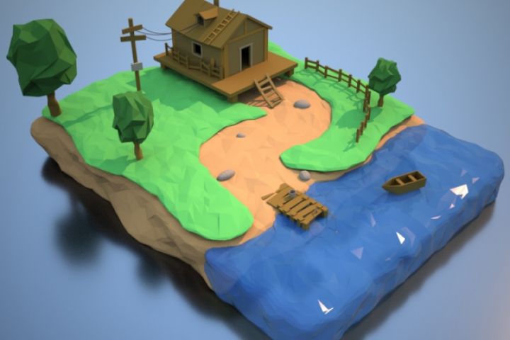 Сцена содержит объекты выполненные в технологии LowPoly. Композиция состоит из домика рыбака острова и озера.