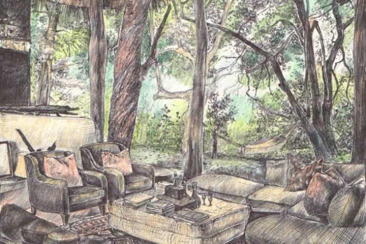 Выполнена чёрной ручкой и цветными карандашами.