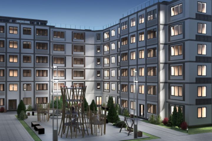 Экстерьер дворового пространства многоквартирного дома для курсового проекта жилого дома средней этажности
