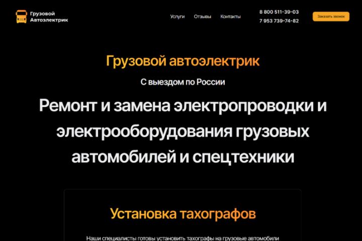 Сайт представляет собой лендинг для грузового автоэлектрика, который занимается ремонтом и заменой электропроводки и электрооборудования грузовых автомобилей и спецтехники.