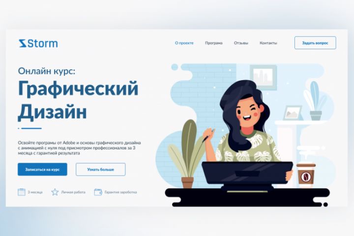 Дизайн Landing Page для студии "Storm", которая проводит обучения в отрасли графических дизайнеров. Ссылка: https://retrorendo.000webhostapp.com/