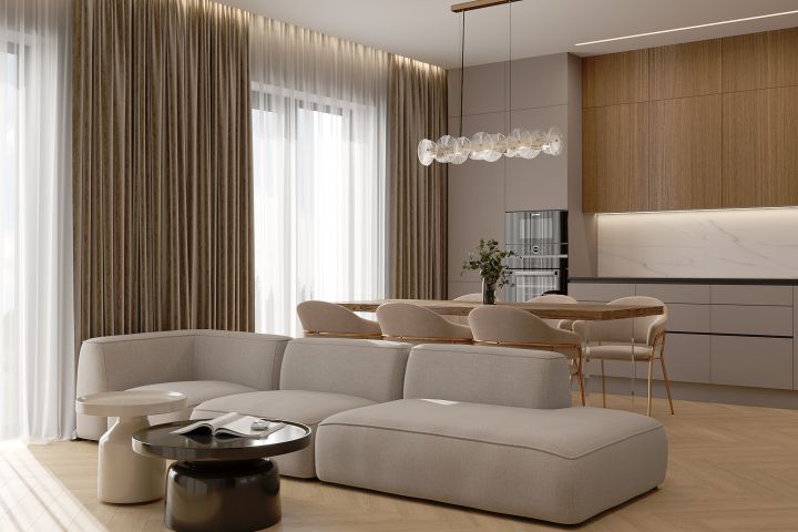 Дизайн был выполнен в спокойных и натуральных оттенках, обволакивающих спокойствием и умиротворением. Заказчица очень любит готовить, поэтому кухне отвели много,как рабочей поверхности, так и мест для хранения. Кухня-гостиная это сердце дома, где вся семья собирается вместе и всем должно быть комфортно, поэтому телевизор просматривается со всех сторон. А так же одно панорамное окно у дивана - это выход на террасу.