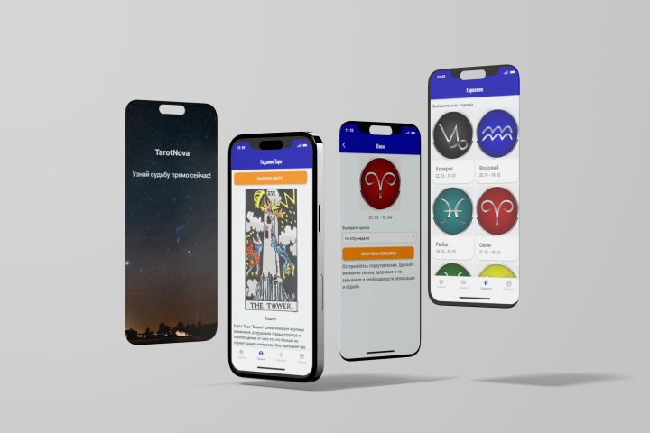 Приложение позволяет получить астрологический прогноз на выбранный временной период. Так же возможно выбрать случайную карту Таро и получить актуальное предсказание.