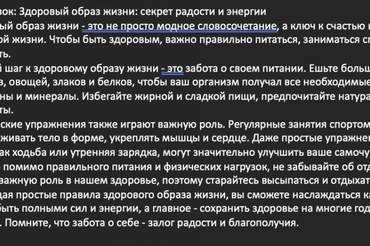 Этот текст относится к категории информационно-образовательных текстов. Его цель — просвещение и мотивация читателей к ведению здорового образа жизни. Он даёт базовые рекомендации по питанию, физической активности и отдыху, подчеркивая их важность для поддержания здоровья, энергии и радости в повседневной жизни. Текст создан для широкой аудитории, стремящейся улучшить своё физическое и эмоциональное состояние, и ориентирован на привлечение внимания к теме здоровья через простые и доступные советы.