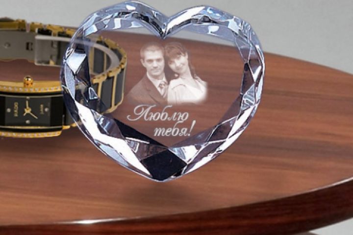 Коллаж: стол, кристалл, фото для гравировки и часы взяты с разных фотографий.