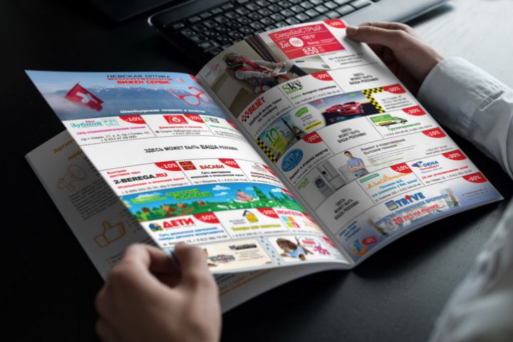 Рекламный буклет "Календарь скидок" – 8 полос А4. Издание состоит из купонов со скидками различных организаций Санкт-Петербурга. Содержание работы: общий дизайн, 21 мелкий рекламный блок, 8 средних и 3 крупных.