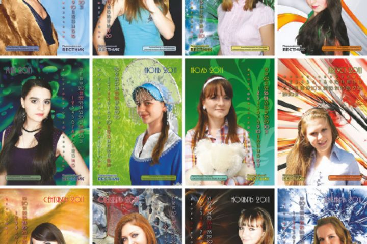 Настенный перекидной календарь формата А3. Городская газета проводила конкурсы красоты и решили выпустить календарь с девушками. Мы совершили полное изготовление: дизайн, верстка, подготовка к печати – из фотографий девушек и листика с текстом. Особая сложность была с парой страниц: на январской оригинал фотографии девушки был только черно-белый, а на июньской кокошник полупрозрачный, и на оригинале за ним был яркий плакат.
