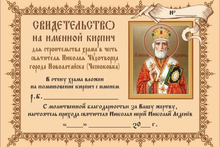 Свидетельство на именной кирпич (храм свт. Николая Чудотворца)