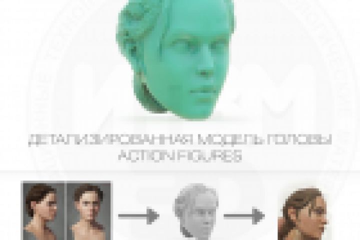 По фотографии воссоздаем детализированную 3D модель, подготавливаем под печать на 3D-принтере. Печатаем фотополимерным пластиком и получаем детализированный образец, который мы красим и получается "Голова Evie".