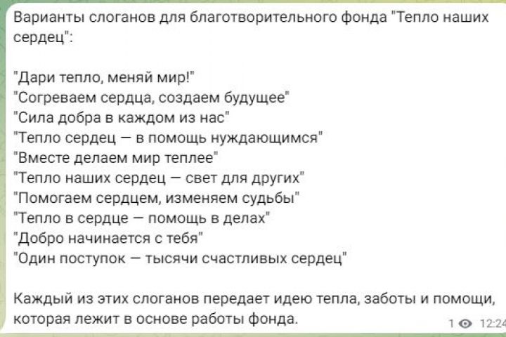 Процесс создания слогана для благотворительного фонда требует глубокого понимания его миссии и ценностей. Я тщательно изучила цели фонда, его проекты и ту помощь, которую он оказывает. Было очень важно, чтобы слоган отражал заботу, искренность и доброту, которые лежат в основе работы "Тепла наших сердец". Кроме того, всегда необходимо учитывать аудиторию фонда — людей, готовых помогать, и тех, кто нуждается в поддержке.