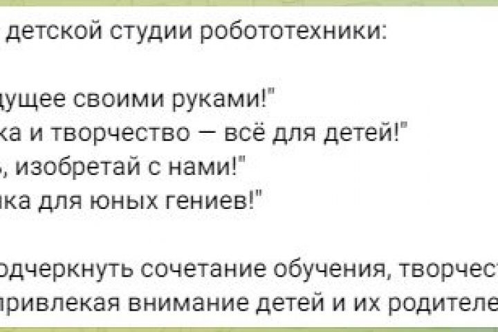 В своей работе над созданием слоганов для детской студии робототехники я фокусировалась на том, чтобы каждая фраза отражала суть обучения, креативность и инновации, которые предлагает студия. Моей целью было разработать слоган, который будет вдохновлять детей на изучение технологий и одновременно привлекать внимание родителей.
