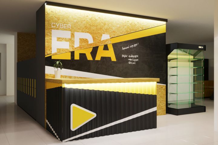 Дизайн и визуализация стойки ресепшн и входной группы для компьютерного клуба.