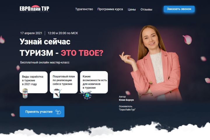 Сайт - Landing - Онлайн мастер класс по Туризму Чтобы сделать заказ напишите мне, буду рад сотрудничеству! +7 (922) 670-12-85 (Whatsapp, Viber) e-mail: websait.pro@mail.ru