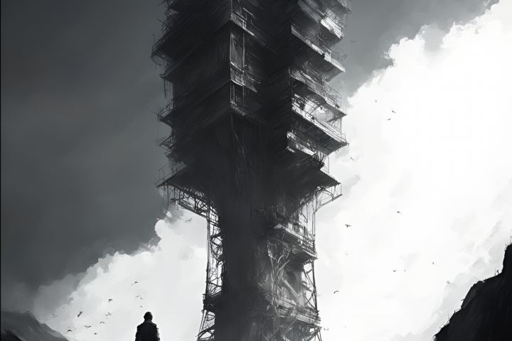 промпт: воздушный поток, человек, башня негативный промпт: транспорт, машины, мотоциклы, девушки, животные стиль: цифровая живопись