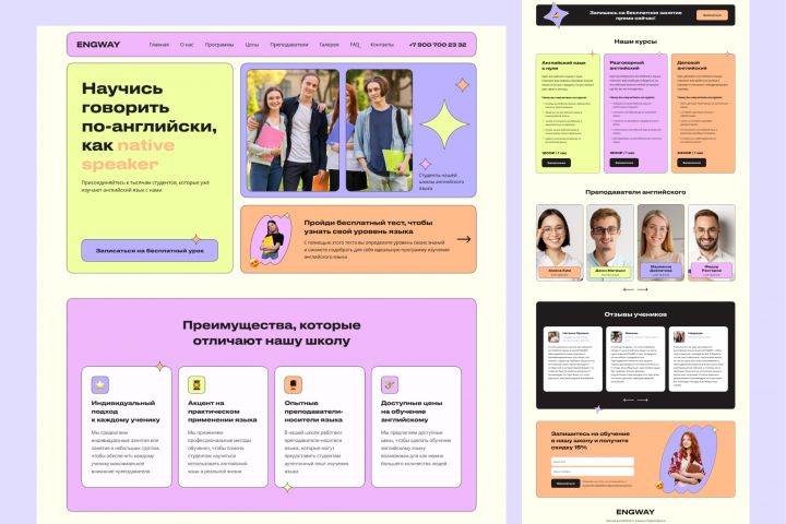 Дизайн сайта разработан с учетом потребностей и пожеланий заказчика. Он отвечает всем требованиям, которые предъявляются к сайтам для школ английского языка.