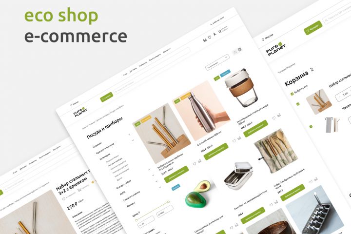 Разработка дизайна трёх страниц концептуального интернет-магазина экологичных товаров: страницу каталога, страницу товара и корзину. Дизайн должен был отражать современный подход к заботе о природе.