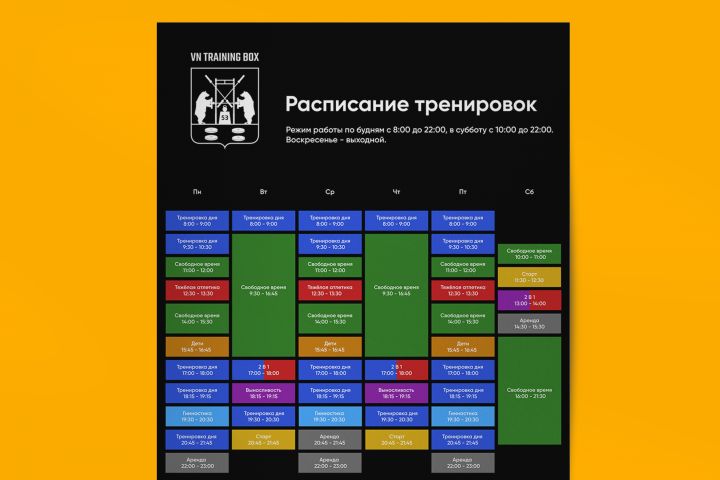 Расписание тренировок для спортивного клуба общей физической подготовки в Великом Новгороде.