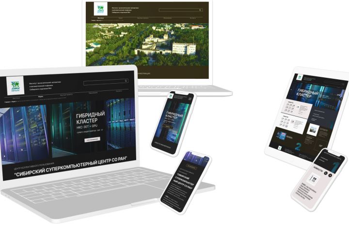 Концепция дизайна сайта для Научно исследовательского института ИВМиМГ СО РАН. Главная страница, страницы примеров использования стиля, прототип, настройки для масштабирования, UI-кит.