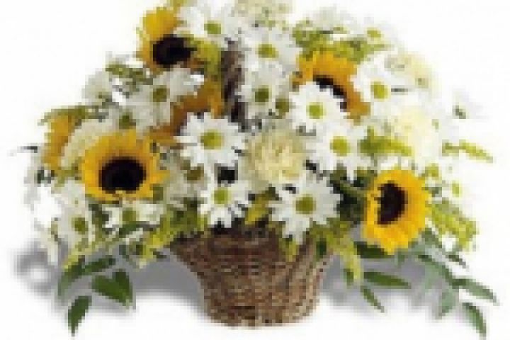 Однажды на берег Средиземного моря волной вынесло русалку. Она лежала на берегу и не могла оторвать очарованного взгляда от огненного шара в небе. Она взмолилась богам Олимпа и пожелала, чтобы этот миг созерцания продлился всю жизнь. И вдруг её хвост погрузился в песок, золотистые волосы превратились в лепестки, а руки стали листьями. Так появился подсолнух. Среди ромашек подсолнухи создают ощущение бликов солнечного света. В этой корзинке – сочетание трогательной чистоты и солнечной праздничности!