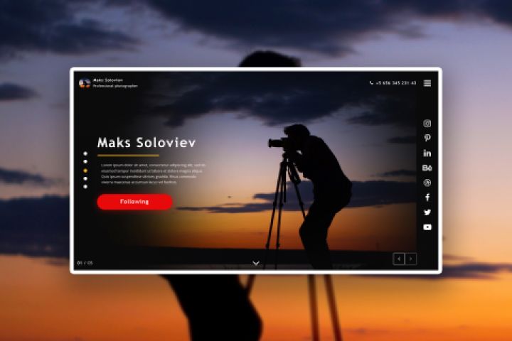 Концепт дизайна сайта для профессионального фотографа. Цветовая схема выдержана в строгих тонах, придающих солидности проекту. Сайт позволяет пользователю ознакомиться с информацией о специалисте, его портфолио, блогом и контактной информацией.