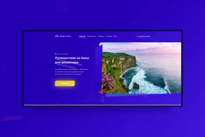 Дизайн одностраничного сайта, посвящённому мероприятию для дизайнеров на острове Бали. Цветовая палитра первого экрана интуитивно напоминает о море.