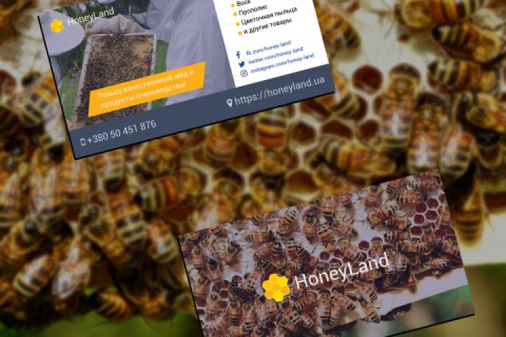 Визитка для небольшого магазина, продающего мёд и продукты пчеловодства. На карточке отображены все необходимые данные (номер телефона, сайт, социальные сети магазина и уникальное торговое предложение). Сама визитка спроектирована в цветовой схеме CMYK и готова к распечатке.