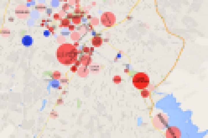 Карта эмоционального отношения жителей к городу Симферополь, где красный цвет - положительные эмоции, а синий - отрицательные.
