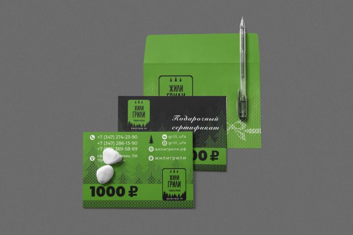 Подарочный сертификат в конверте для компании Жилигрили, в рамках разработанного мною фирменного стиля.