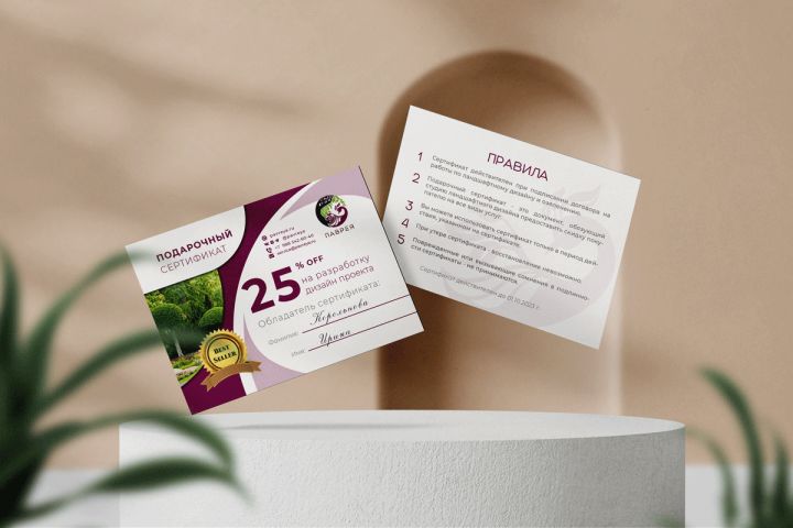 Сертификат подарочный в рамках созданного мною фирменного стиля компании.