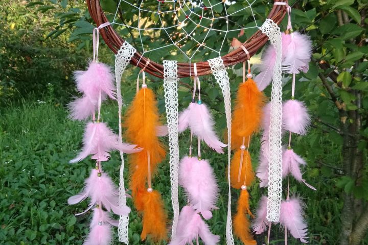 материалы при изготовлении: перья, виноградная лоза, бусины, шелковая нить, кружева