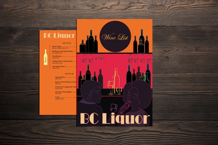 Создать логотип для винного бара BC Liquor, оформить дизайн винной карты и меню снеков, создать запоминающихся персонажей и айдентику, подготовить карту и меню к печати.