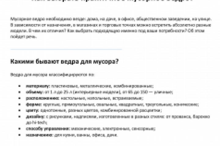 Статья длительное время находилась в топе, подтверждения в тексте. Она оптимизирована по технике LSI, выполнена проверка по Тургеневу. Иллюстрации подобраны и оформлены мной. Полную версию можно прочитать на сайте заказчика: https://decoriko.ru/usefull/kak_vybrat_praktichnoe_musorno/