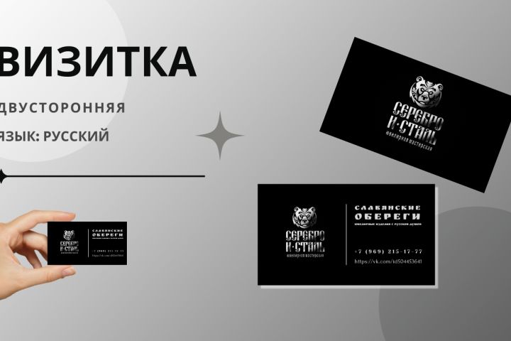 Двусторонняя визитка для мастерской дизайнерских ювелирных изделий в минималистичном стиле. Основные цвета: чёрный и серебряный. Дизайн подчёркивает строгость и лаконичность, создавая элегантный и премиальный образ, идеально отражающий дух ювелирного мастерства.