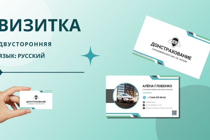 Двусторонняя визитка для страхового агента в минималистичном стиле. Основные цвета: мятный, голубой и белый. Дизайн подчёркивает профессионализм и современный подход, используя лаконичные элементы и нежные цветовые акценты для создания доверительного и спокойного образа.