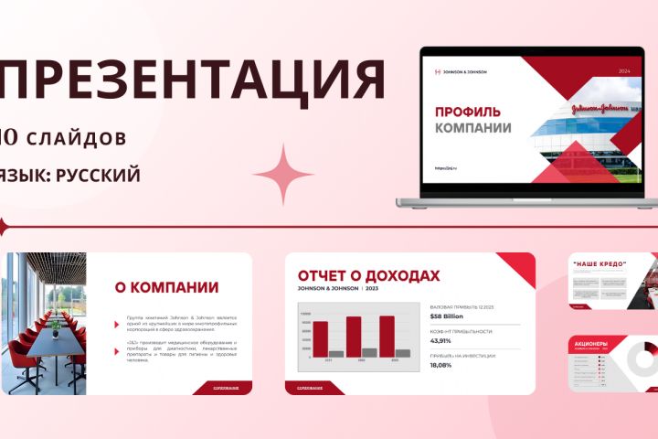 10-слайдовая бизнес-презентация в минималистичном стиле для компании Johnson & Johnson. Основные цвета: красный и белый. Проект выполнен с акцентом на чистоту дизайна и ясность информации, идеально подходящий для деловых встреч и презентаций.