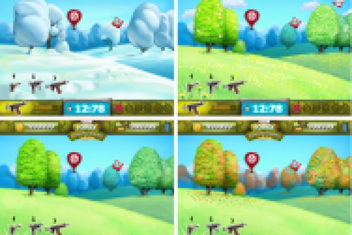 - в игре 4 уровня: весна, лето, осень и зима, - с каждым последующим увеличивается число объектов на экране и их скорость,