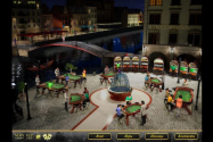 Анимированное лобби для Интернет казино Грандтаун (www.grandtowncasino.com) с играющими людьми, горящими вывесками, плещющимся фонтаном и плавающей лодкой.