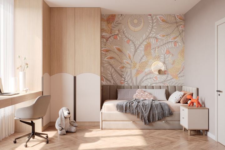 Просторная светлая детская комната, в бежевых тонах. За счет подобранных сочетаний материалов дерева, обоев и покраски - получилось создать светлое уютное помещение, в котором есть все необходимое для ребенка. Дизайн получился "навырост", будет актуален долгие годы, за счет своей универсальности.