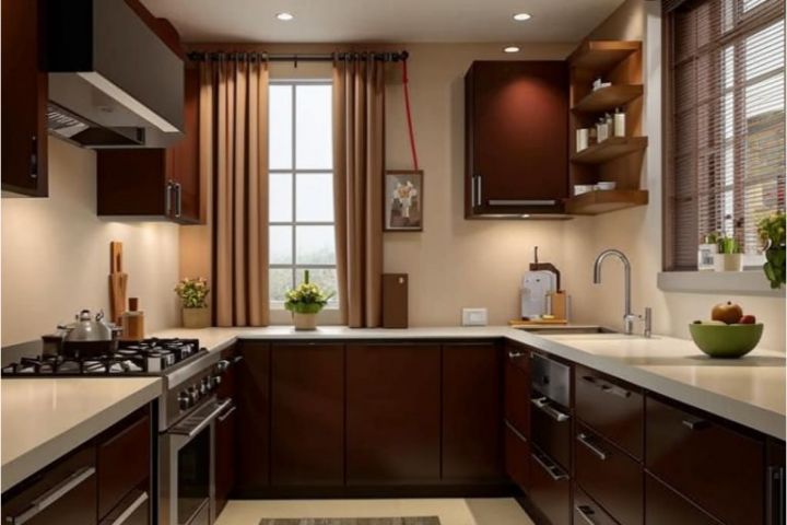 Современная кухня в тёплых коричневых и бежевых тонах. Шкафы выполнены в темно-коричневом цвете с глянцевыми фасадами и серебристыми ручками. Столешницы светлого бежевого цвета, из искусственного камня или другого гладкого материала. В центре и на боковой стене кухни находятся окна. Кухня оборудована варочной панелью, духовкой, вытяжкой и раковиной с высоким краном. На стенах установлены открытые полки с мелочами и декором.