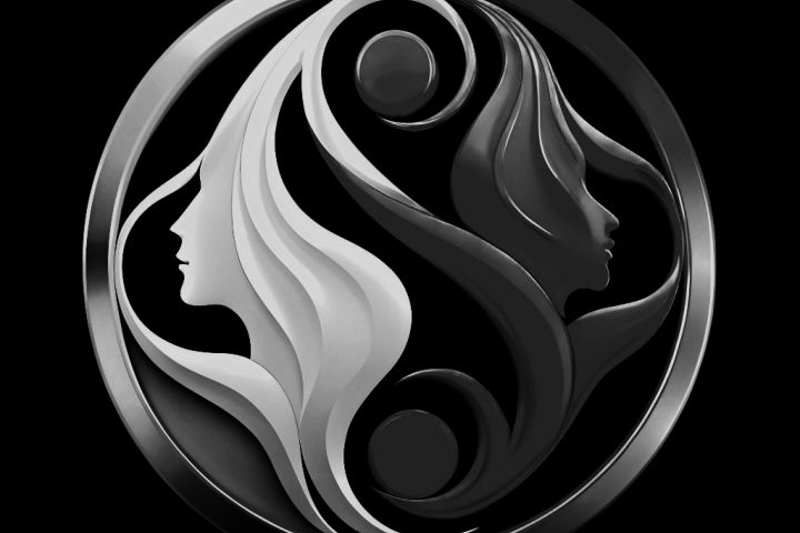 Логотип представляет собой символ в стиле Инь-ян, выполненный в монохромных тонах. Левая часть логотипа светлая, символизирует женственность и плавность, с профилем женского лица, обрамлённого длинными волосами. Правая часть тёмная, с аналогичным профилем, но в зеркальном отображении. Линии создают ощущение движения и гармонии, передавая идею равновесия и взаимодополняемости. Логотип подчёркивает концепцию красоты и баланса, идеально подходя для парикмахерской, стремящейся к гармонии внешности и стиля.