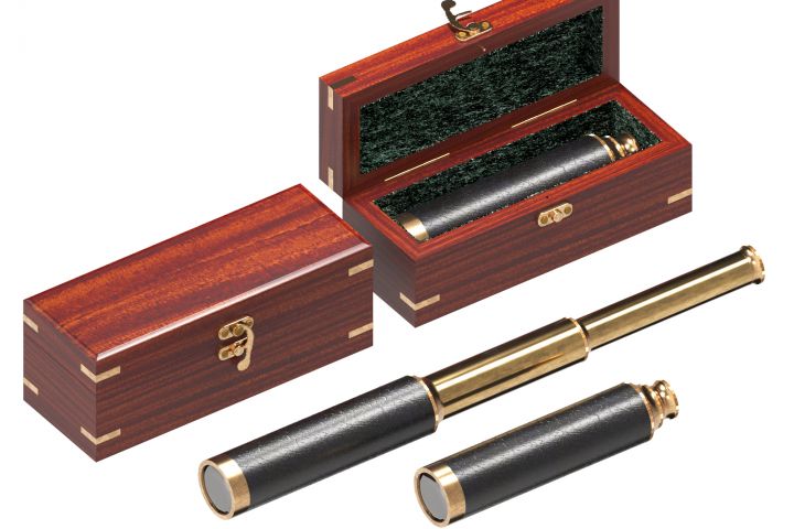 Такие сувениры, как подзорная труба или компас, помогут почувствовать себя первооткрывателем, ощутить дух приключений. Подзорная труба имеет мощную лупу при довольно скромных размерах, она придаст вашему кабинету значимости и аристократизма, создаст личный, неповторимый стиль. Подзорная труба с кожаным покрытием в деревянном футляре. Размер корпуса: 160 х 60 х 60 мм. Длина телескопа: 310 мм. Диаметр объектива 33 мм. Материал: Латунь. Модель тщательно детализирована.